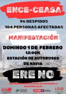 Por todo ello desde USO industrial Asturias,​ y desde la Federación estatal, pedimos una muestra de solidaridad y apoyo a los compañeros de CEASA-ENCE acudiendo a la manifestación convocada para el próximo domingo que partirá desde la estación de autobuses de Navia y hará un recorrido por la villa naviega. (​ver cartel)​.